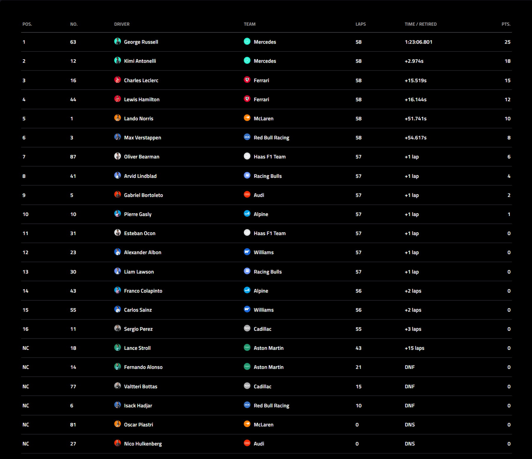 Στην 5η θέση βρέθηκε ο Norris, ενώ ο Verstappen, ξεκινώντας από το τέλος του grid, τερμάτισε έκτος.