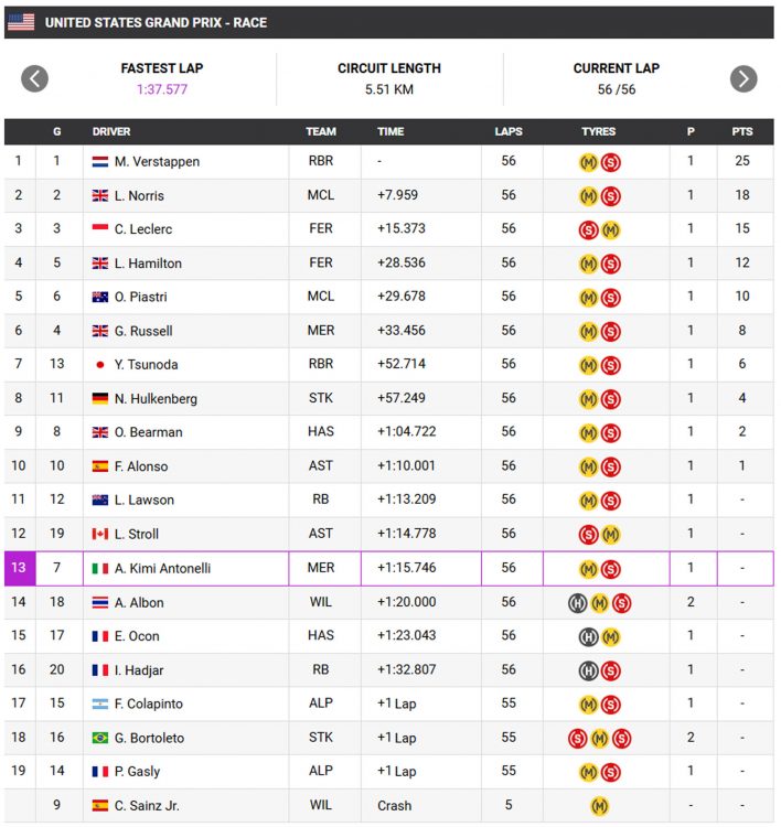 Λίγο πιο πίσω, μια επαφή μεταξύ του Carlos Sainz και του νεαρού Andrea Kimi Antonelli στη στροφή 15 έθεσε εκτός αγώνα τον Ισπανό και προκάλεσε virtual safety car στον 7ο γύρο. Ο Antonelli συνέχισε, αλλά είχε ήδη πέσει εκτός δεκάδας.