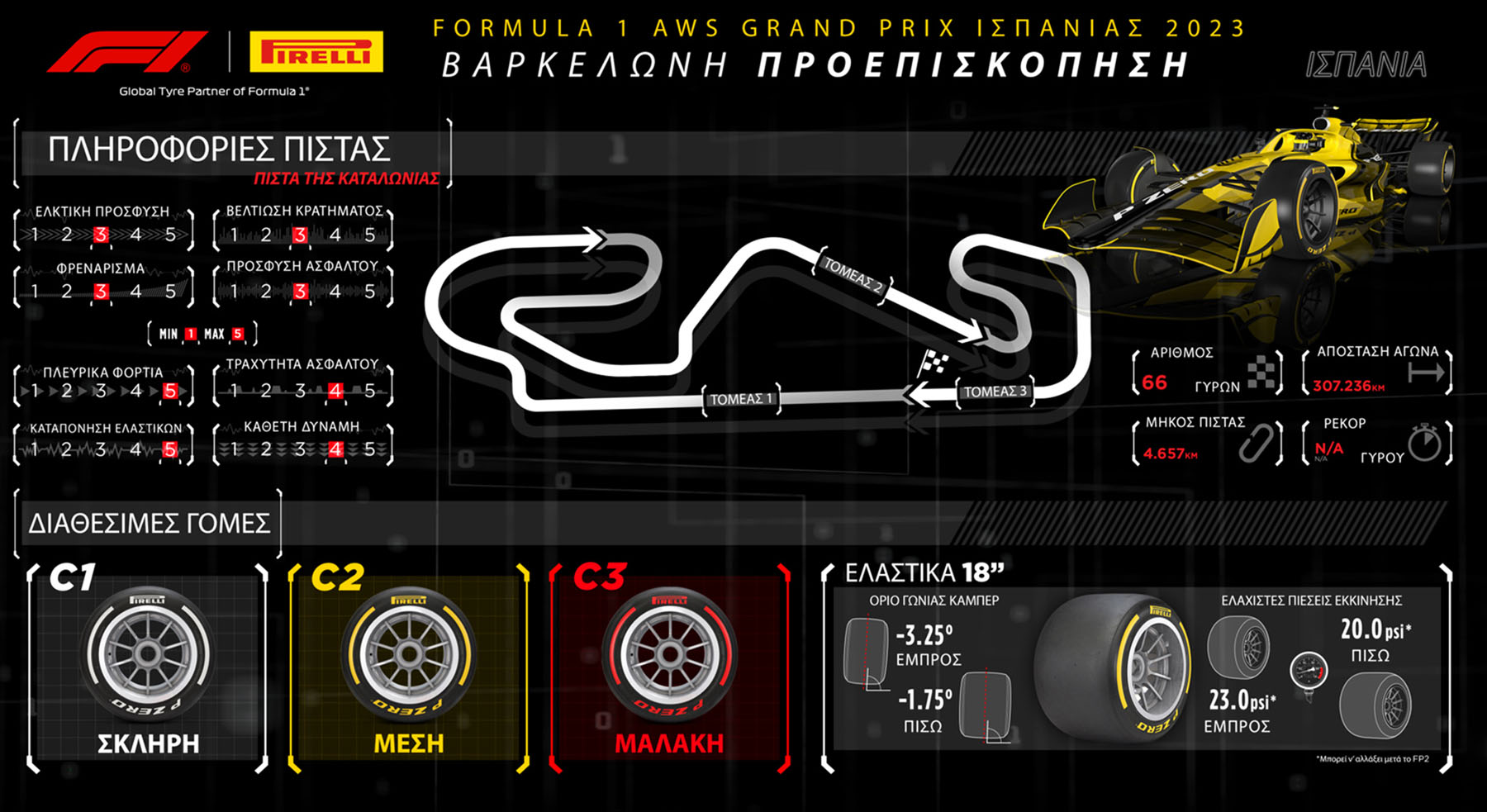 Οι ομάδες θα έχουν στη διάθεσή τους στη Βαρκελώνη, τη γόμα C1 ως P Zero λευκή σκληρή, τη γόμα C2 ως P Zero κίτρινη μέση και τη γόμα C3 ως P Zero κόκκινη μαλακή.