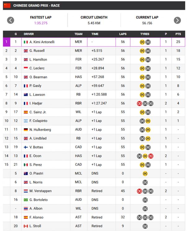 Δεύτερη νίκη στο δεύτερο Γκραν Πρι της σαιζόν για τη Mercedes, αλλά αυτή τη φορά όχι με τον George Russell αλλά από τον Kimi Antonelli, που στα μόλις 19 του χρόνια ανέβηκε για πρώτη φορά στην καριέρα στην κορυφαία θέση του βάθρου.