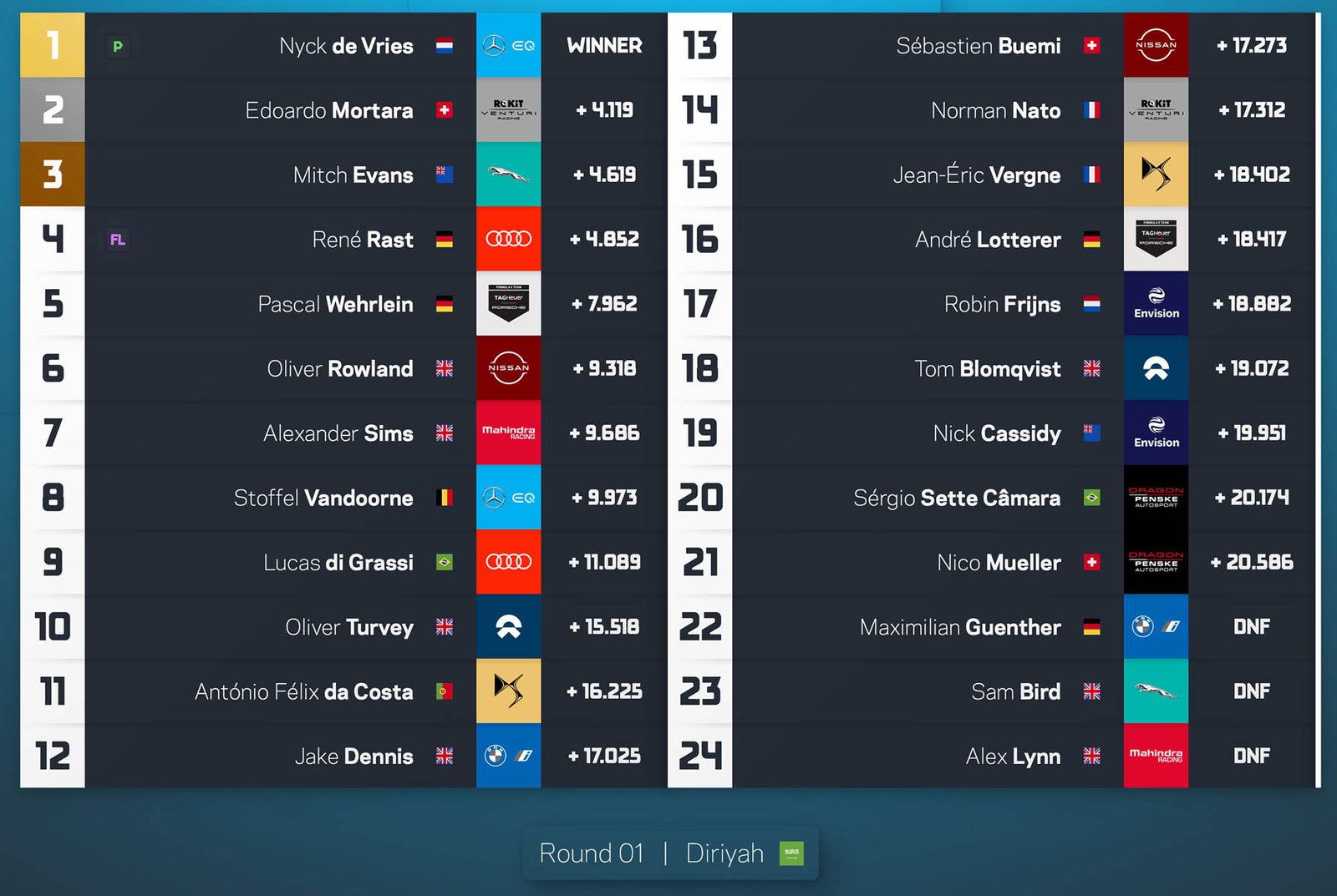 Στον πρώτο αγώνα τα φετινής σαιζόν της Formula e στην πίστα του Diriyah η Mercedes EQ πήρε τη νίκη με τον de Vries, o οποίος τερμάτισε μπροστά από τους Mortara (Venturi) και Evans (Jaguar).