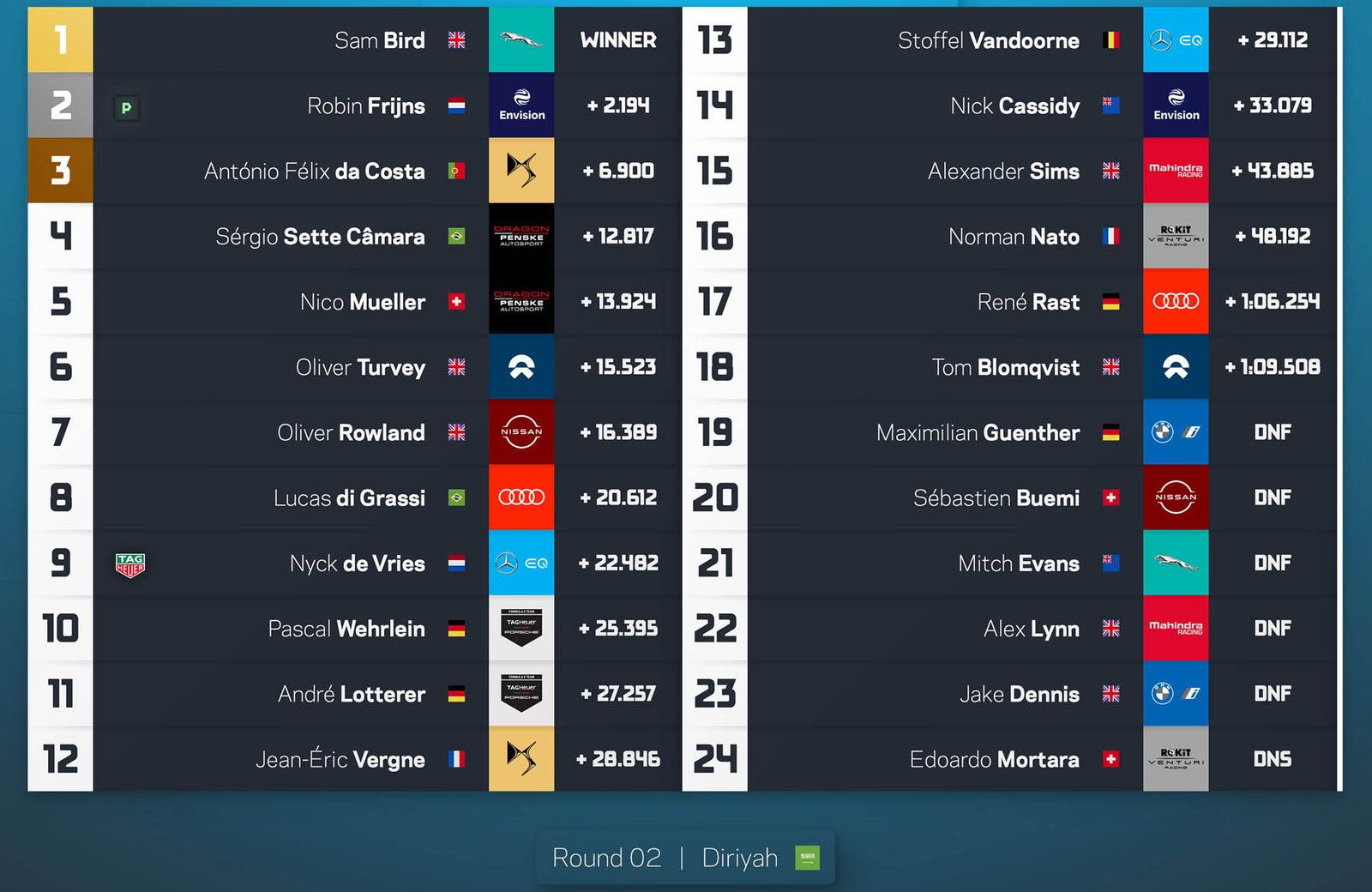 Στη βαθμολογία προηγείται ο Nyck de Vries με 32 βαθμούς (είχε ταχύτερο γύρο και μια pole position), ενώ ακολουθούν οι Sam Bird και Eobin Frijns με 25 και 22 βαθμούς αντίστοιχα. Επόμενος αγώνας στην Ιταλία και στη Ρώμη στις 10 Απριλίου.