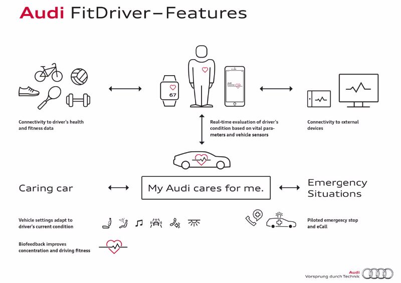 Η επόμενη κατεύθυνση προς την οποία κινείται η Audi είναι η αποφόρτιση της υγείας του οδηγού, που. επιτυγχάνεται με το να φτάνει στο τέλος της εκάστοτε διαδρομής χαλαρός και όχι εκνευρισμένος Το σύστημα λέγεται Audi Fit Drive, συνεργάζεται με ένα σύστημα ελέγχου της φυσικής κατάστασης όπως το FitBit ή με το Apple Watch, που μετρούν παραμέτρους όπως τους παλμούς της καρδιάς ή τη θερμοκρασία του σώματος και προσαρμόζουν ανάλογα τον τρόπο λειτουργίας των διαφόρων συστημάτων του αυτοκινήτου.