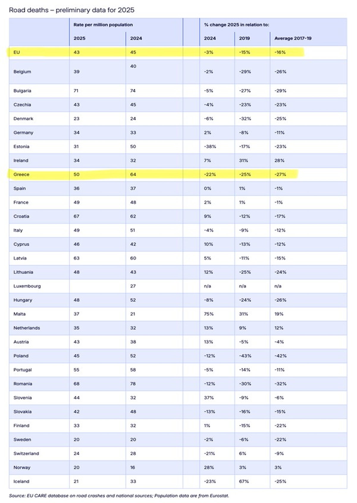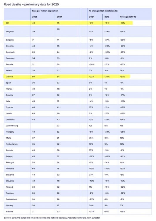 Από την άλλη από τα στοιχεία προκύπτει πως, παρά τη σημαντική βελτίωση, η Ελλάδα εξακολουθεί να βρίσκεται πάνω από τον ευρωπαϊκό μέσο όρο (50 έναντι 43 θανάτων ανά εκατομμύριο κατοίκων), κάτι που δείχνει ότι υπάρχει ακόμη περιθώριο περαιτέρω προόδου.