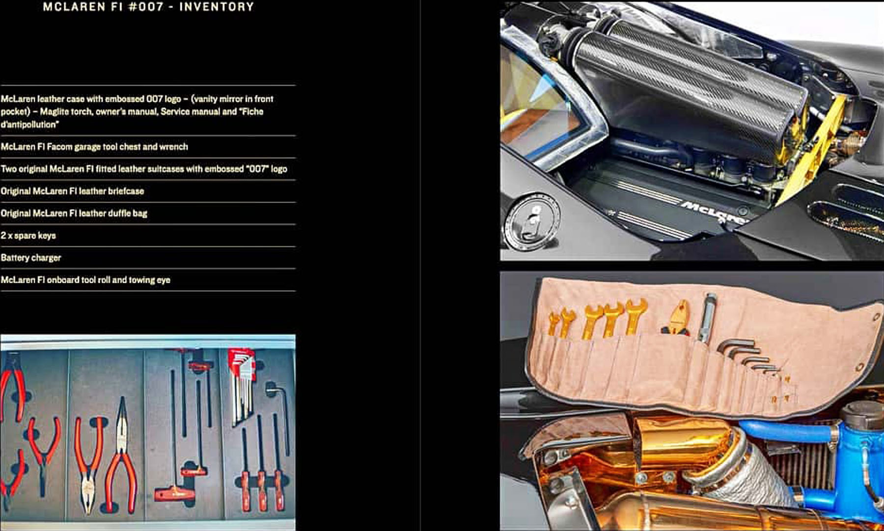 Το supercar ή μήπως καλύτερα hypercar συνοδεύεται επίσης από το πλήρες αυθεντικό πακέτο εξοπλισμού που παραδιδόταν στους πρώτους ιδιοκτήτες. Σε αυτό περιλαμβάνονται το αριθμημένο σετ αποσκευών, εργαλειοθήκη Facom, εργαλεία από τιτάνιο, δερμάτινη τσάντα εγγράφων, ταξιδιωτική τσάντα καθώς και όλα τα αρχικά εγχειρίδια και βιβλία συντήρησης.
