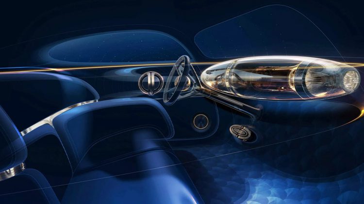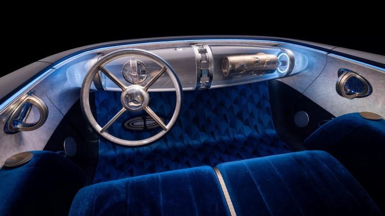 Η καμπίνα του Vision Iconic είναι ένα αληθινό ταξίδι στο χρόνο: Art Deco σχεδιασμός, βελούδινα καθίσματα σε βαθύ μπλε, παλαιάς τεχνοτροπίας δάπεδα από μαρκετερί και ψηφιακά αναλογικά όργανα που συνυπάρχουν με AI βοηθό.