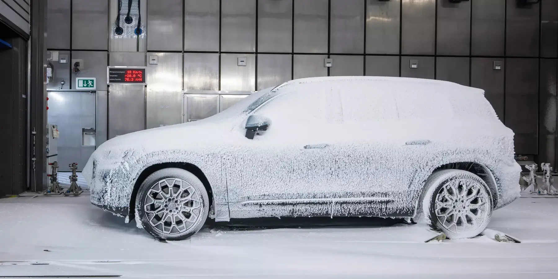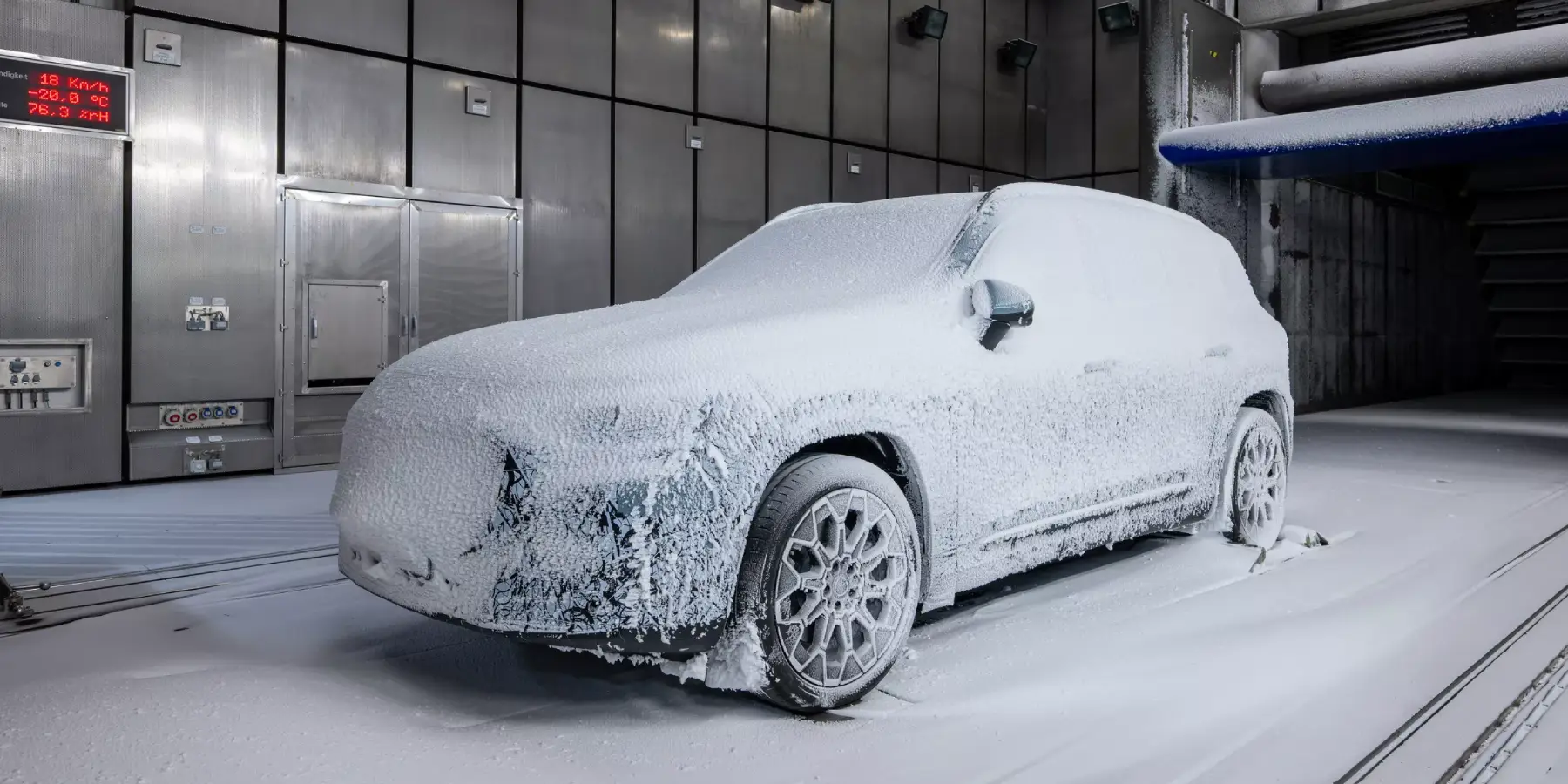 Το νέο SUV βρίσκεται στο τελικό στάδιο εξέλιξης και υποβάλλεται σε εκτεταμένες δοκιμές στο τεχνολογικό κέντρο της Mercedes στο Sindelfingen, με προσομοιώσεις ακραίων συνθηκών ψύχους έως -40°C. Στα ειδικά τούνελ δοκιμών, εκτοξεύονται τεχνητές νιφάδες χιονιού με ταχύτητες που φτάνουν τα 200 χλμ./ώρα, ώστε να ελεγχθεί η αντοχή του αμαξώματος και η απόδοση των συστημάτων θέρμανσης. Σύμφωνα με τη Mercedes, η νέα ηλεκτρικά GLB EQ θερμαίνει το εσωτερικό της δύο φορές πιο γρήγορα σε σχέση με την EQB καταναλώνοντας ταυτόχρονα, χάρη σε ένα νέο κύκλωμα αντλίας θερμότητας που ανακτά θερμότητα από τους ηλεκτροκινητήρες, τη μπαταρία και τον αέρα, τη μισή ενέργεια.