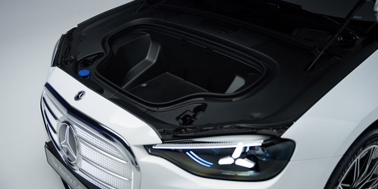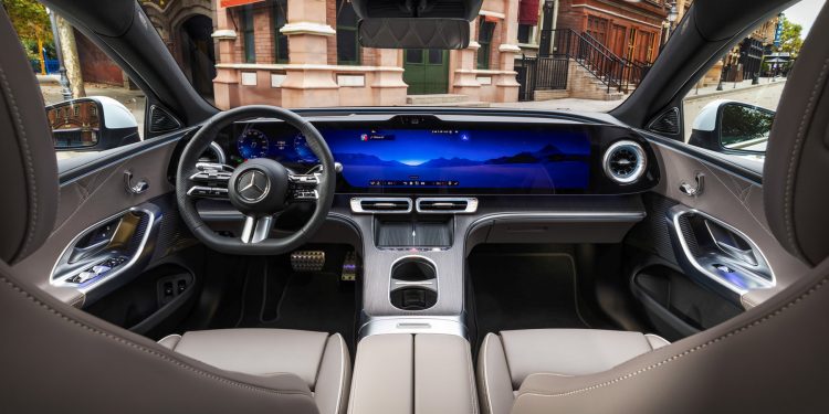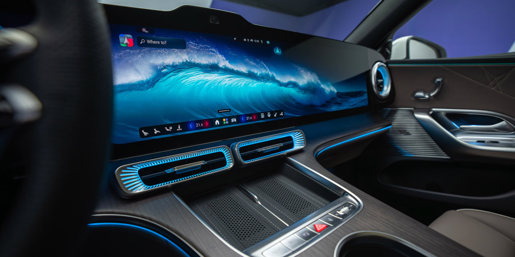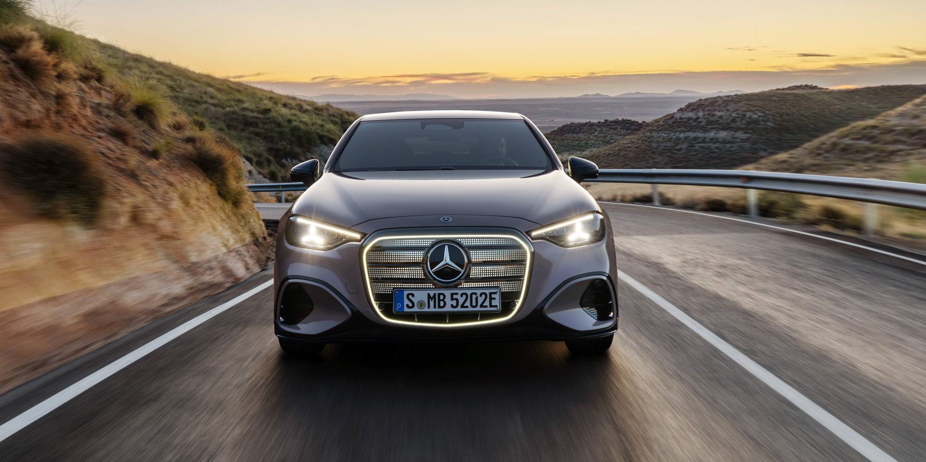 Το εμπρός μέρος καθορίζεται από τη φωτιζόμενη μάσκα με το μεγάλο αστέρι και τα 1.050 φωτεινά στοιχεία, μια σχεδιαστική υπογραφή που ενισχύει την ταυτότητα των νέων ηλεκτρικών Mercedes. Τα λεπτά φωτιστικά σώματα, οι κοντοί πρόβολοι και οι έντονες επιφάνειες δημιουργούν ένα σύνολο που απέχει αισθητά από την πιο συντηρητική εικόνα των έως τώρα θερμικών εκδόσεων.