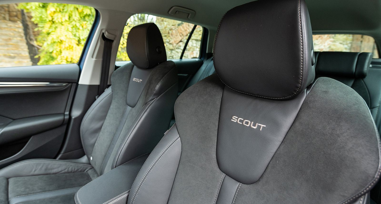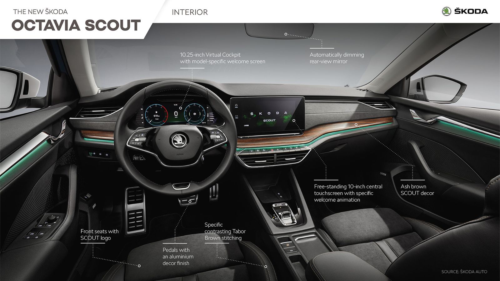 Στο εσωτερικό, η νέα OCTAVIA SCOUT διαθέτει κάποιες αποκλειστικές λεπτομέρειες που της εξασφαλίζουν το δικό της, ιδιαίτερο στυλ. Σε αυτές περιλαμβάνονται διακοσμητικές λωρίδες στο ταμπλό (στάνταρ στο στυλ ξύλου στο χρώμα της τέφρας ή προαιρετικά με ασημί φινίρισμα), επενδύσεις καθισμάτων ThermoFlux και λογότυπα SCOUT στα εμπρός καθίσματα.