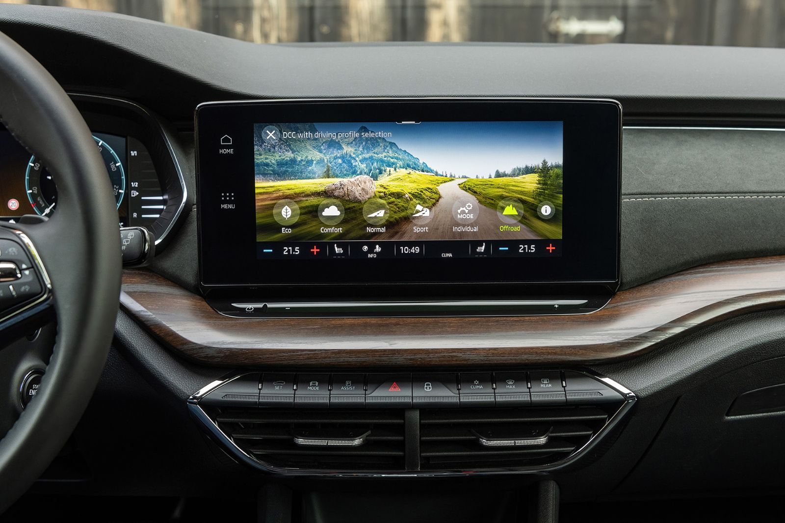 Η απόσταση από το έδαφος είναι αυξημένη κατά 15 χιλιοστά (συνολικά 163), κάνοντας την OCTAVIA SCOUT ιδανική για οδήγηση εκτός δρόμου. Η στάνταρ off-road λειτουργία ενεργοποιείται μέσω της κεντρικής οθόνης στο Driving Mode Select. Η συγκεκριμένη λειτουργία προσαρμόζει τις ρυθμίσεις της ανάρτησης στις συνθήκες κίνησης σε χωματόδρομους και τραχιές επιφάνειες. Το πεντάλ του γκαζιού γίνεται λιγότερο ευαίσθητο και το DSG αλλάζει ταχύτητα σε πιο υψηλές στροφές του κινητήρα. Το πακέτο περιλαμβάνει επίσης Hill-Descent Assist. Ο πίσω άξονας πολλαπλών συνδέσμων παρέχει υψηλά επίπεδα άνεσης και καλά δυναμικά χαρακτηριστικά.