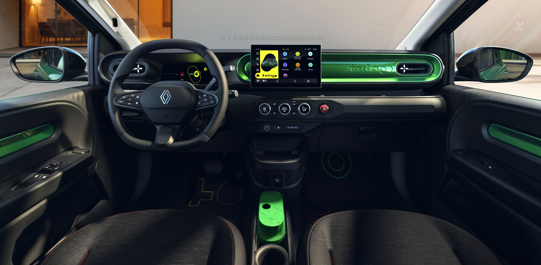 Το εσωτερικό συνδυάζει τη ρετρό πλέον εικόνα του παλιού Twingo με τη σύγχρονη εργονομία. Το ταμπλό με τους κυκλικούς αεραγωγούς, οι φυσικοί διακόπτες για τον κλιματισμό και λεπτομέρειες όπως το κόκκινο κουμπί των alarm διατηρούν το γνώριμο στυλ του παρελθόντος. Ο εξοπλισμός περιλαμβάνει ψηφιακό πίνακα οργάνων 7,0 ιντσών και οθόνη αφής 10,0 ιντσών.