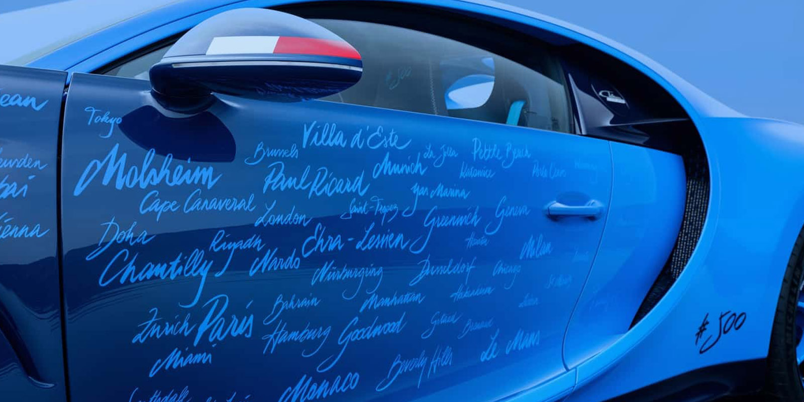 Η Chiron L’Ultime διαθέτει ένα εντυπωσιακό χρώμα που περνάει από το γαλλικό αγωνιστικό μπλε στο μπλε του Ατλαντικού, διακοσμημένο με χειρόγραφα ονόματα σημαντικών γεγονότων και τόπων στην ιστορία της Chiron.