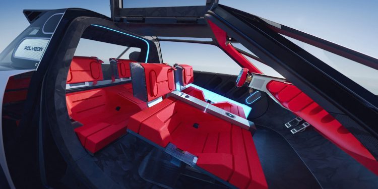 Το Polygon Concept παρουσιάζει και τη νέα γενιά του Peugeot i-Cockpit, που μεταμορφώνει την καμπίνα σε έναν high-tech χώρο ελέγχου. Όλες οι πληροφορίες προβάλλονται πλέον στο παρμπρίζ μέσω ενός micro-LED πάνελ με διαστάσεις που αντιστοιχούν σε οθόνη 31 ιντσών, εξαλείφοντας τις παραδοσιακές οθόνες του ταμπλό. Οι πληροφορίες είναι πλήρως εξατομικεύσιμες και μεταβάλλονται ανάλογα με τη λειτουργία οδήγησης -από το Cruise μέχρι το Hyper mode- δημιουργώντας μια καθηλωτική εμπειρία φωτός και κίνησης που επεκτείνεται και στο εξωτερικό του αυτοκινήτου.