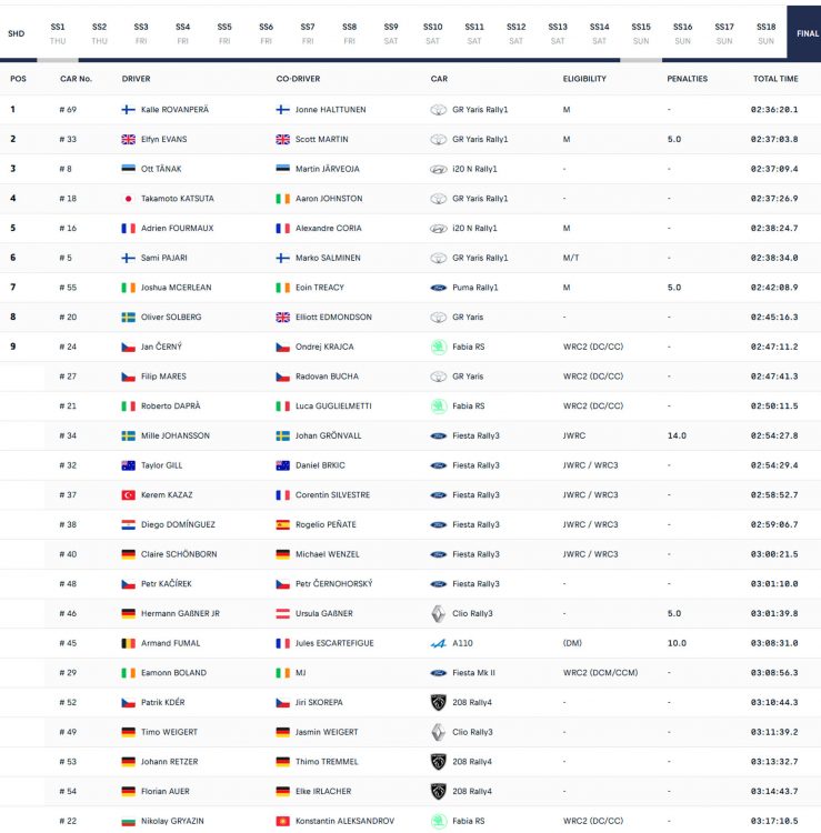 Ο Evans, αν και δεν κατάφερε να ακολουθήσει το ρυθμό του Rovanpera, πήρε πολύτιμους βαθμούς που τον επανέφεραν στην κορυφή της βαθμολογίας των οδηγών, ενόψει του φινάλε της σεζόν. Τρίτος τερμάτισε ο Ott Tanak με Hyundai, ο οποίος όμως έχασε τη δεύτερη θέση στην τελική Power Stage για μόλις 5,6 δευτερόλεπτα -ένα αποτέλεσμα που δείχνει πόσο έντονος παραμένει ο ανταγωνισμός στην κορυφή.